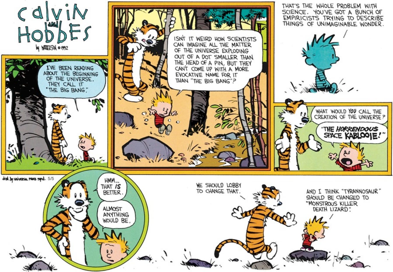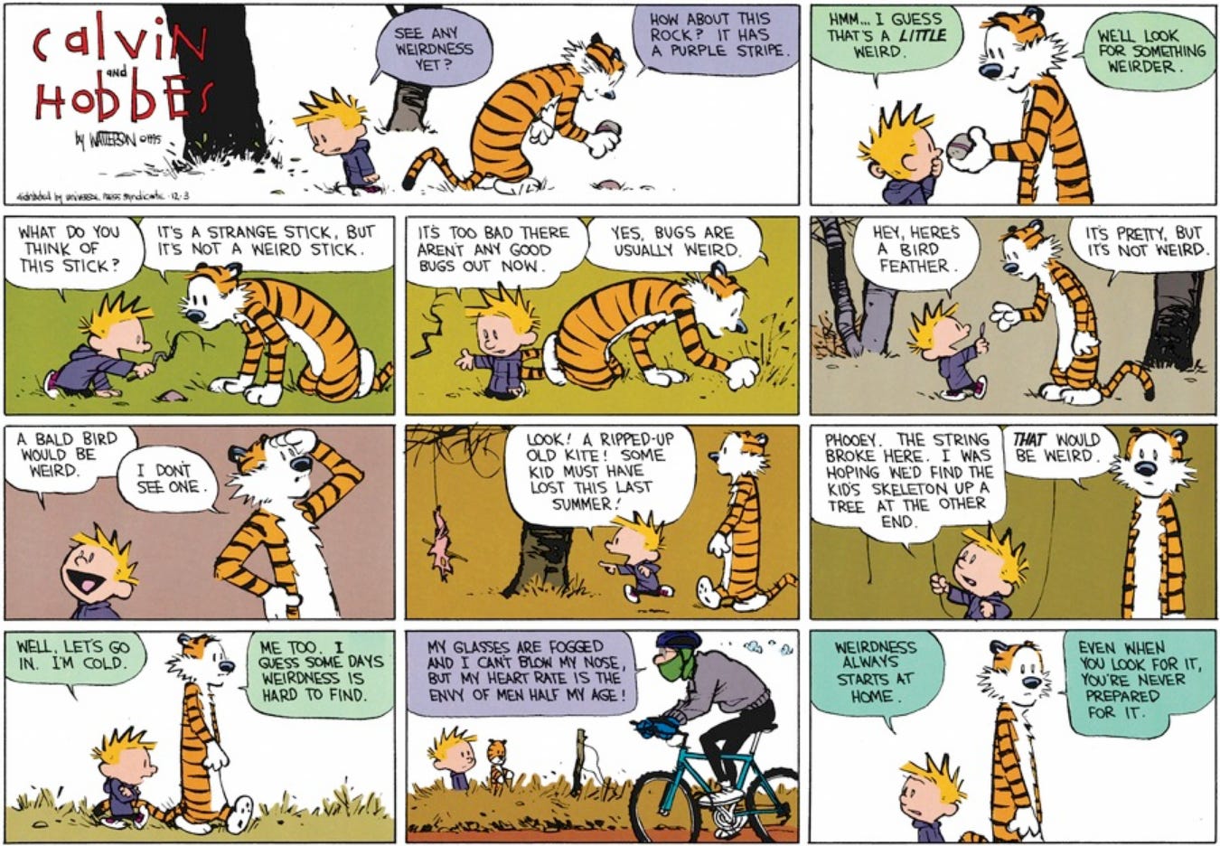 The subject of nature is explored often in Calvin and Hobbes, certainly another theme that attracted me to them. The expression of wonder is much helped by Watterson’s imaginative and detailed artwork.