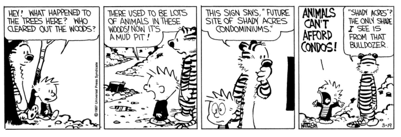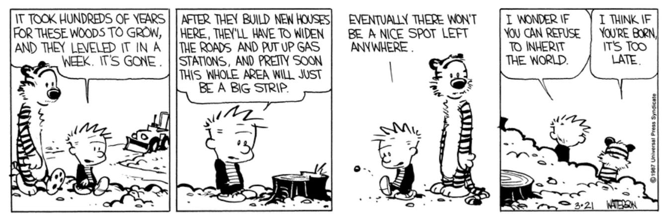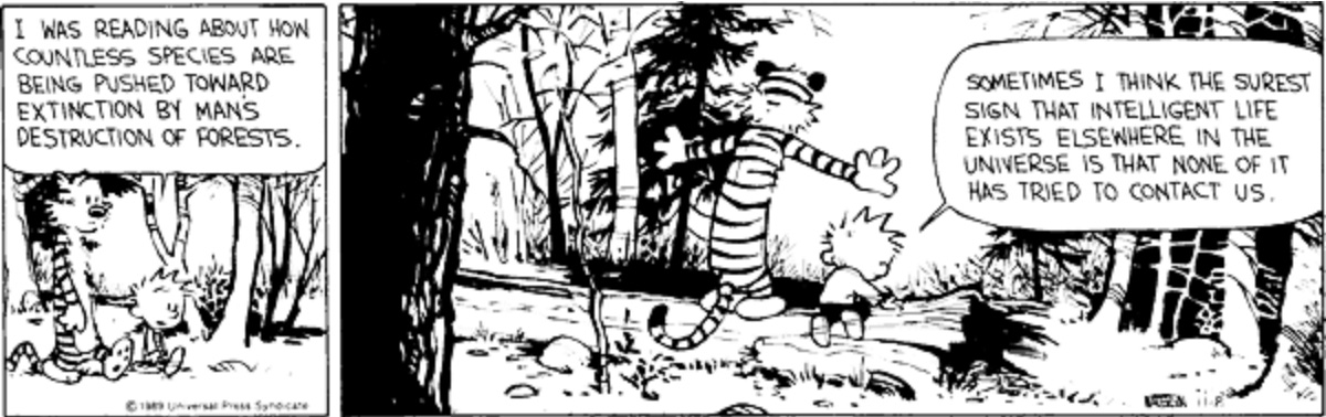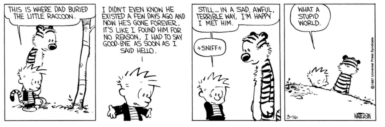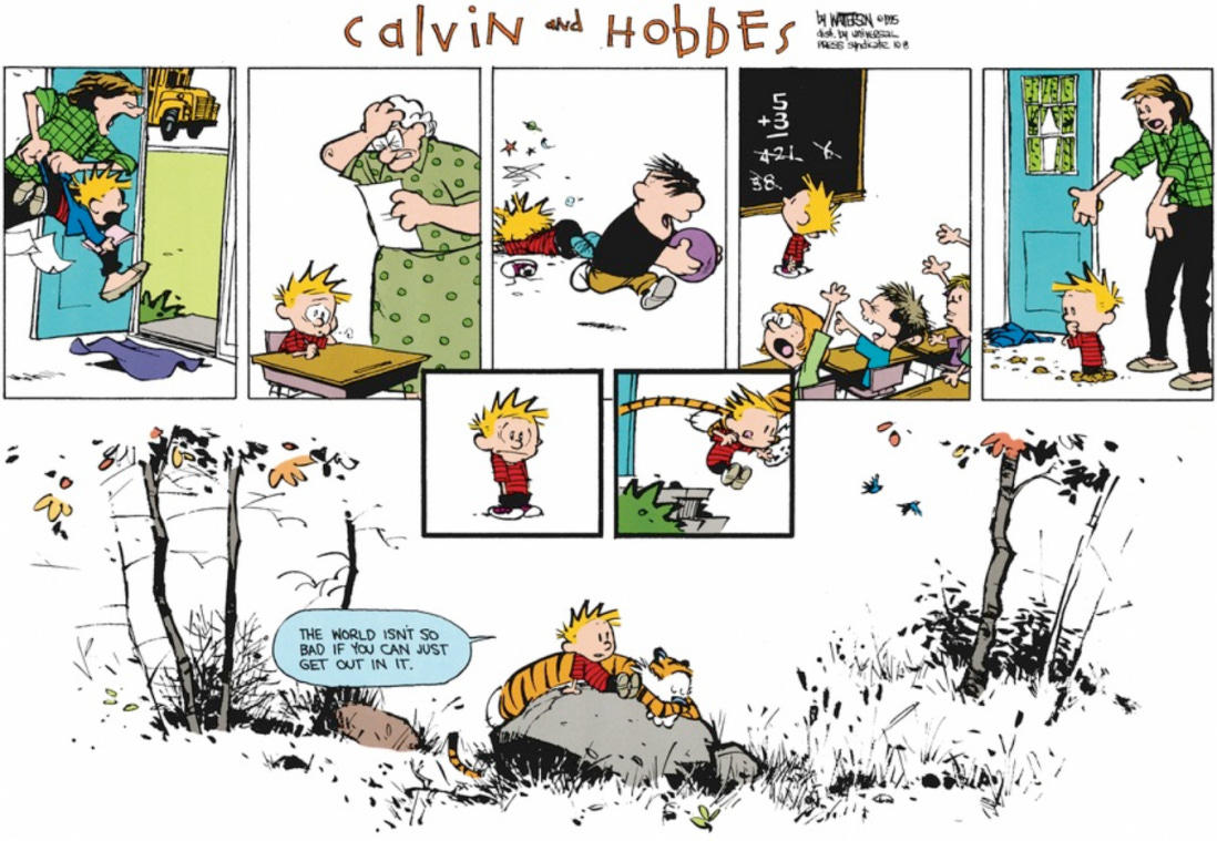 Calvin is a peculiar child, and there is a great mutual lack of understanding between him and the rest of society. He often seeks solace outside with Hobbes.