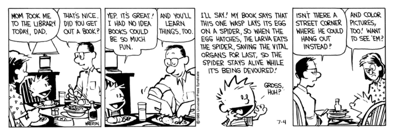 Calvin and Hobbes is generally considered one of the best newspaper comic strips of all time. My family owned the complete collection when I was growing up, and I have fond memories of reading through them. Bill Watterson’s illustrations are excellent, and he regularly touched on deep philosophical themes through the comics. Some have even gone as far as describing the strip as “great modern literature”.